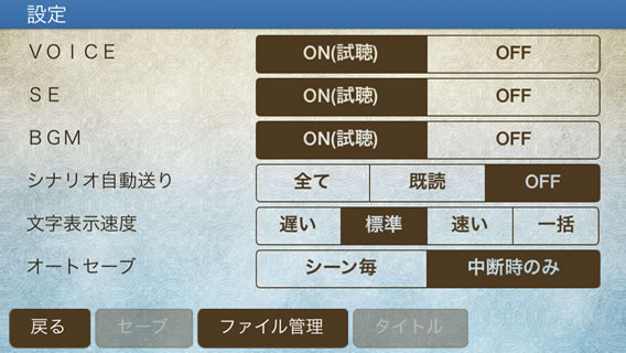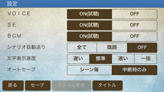 タイトル画面の「設定」ボタンをタップすると設定画面が表示されます。