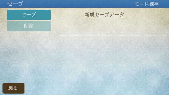 「セーブ」ボタンをタップし、「新規セーブデータ」をタップしますと新規セーブデータが作成されます。
