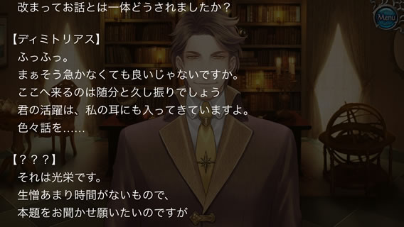ゲーム画面から「メニュー」ボタンをタップしメニューの中から「シナリオ履歴」をタップしますと、メッセージの履歴画面が表示されます。