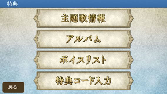 タイトル画面から、「特典」をタップすると特典画面が表示されます。