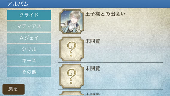 「アルバム」では、項目名を選択しタップして頂きますとゲーム内で表示されたスチルを見ることができます。