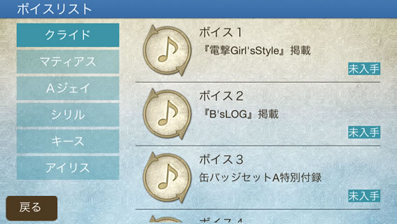 「ボイスリスト」では「特典コード入力」で入手した限定ボイスを聴くことができます。