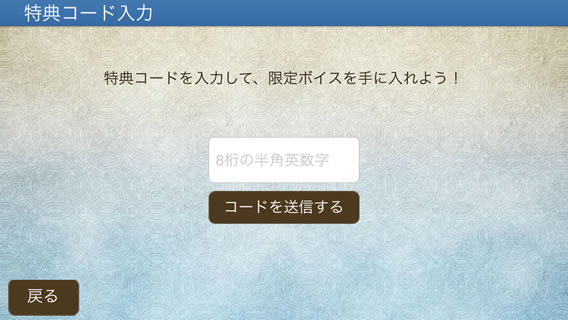 「特典コード入力」では、入手したシリアルコードを入力すると限定ボイスが入手できます。