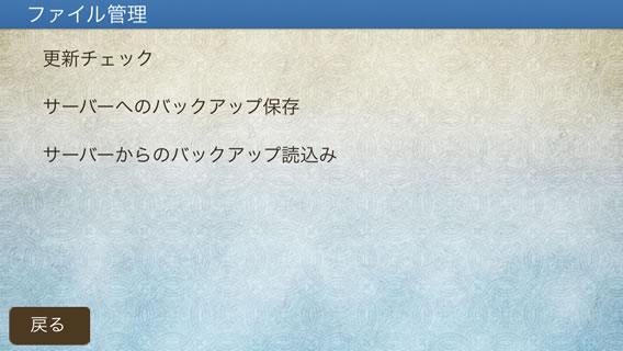 タイトル画面より移動した際の設定画面より、「ファイル管理」をタップするとファイル管理画面が表示されます。